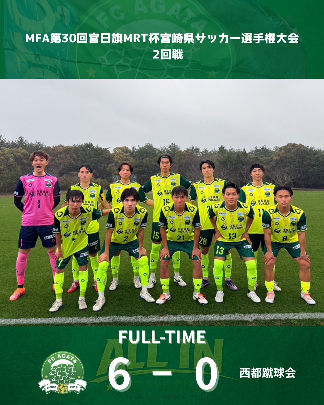 FC延岡AGATA 2026シーズン最初の公式戦は、天皇杯宮崎県予選2回戦。初対戦となる宮崎県リーグ所属・西都蹴球会との一戦となりました。雨の降る中で迎えた試合前、監督からは「応援していただけるすべての人への感謝を忘れず、アグレッシブにプレーしよう」との言葉があり、チーム全体で意識を統一して試合に臨みました。キックオフは延岡ボール。ロングボールからセカンドボールを回収すると、高瀬選手がグラウンダーのクロスを供給。これをゴール前で受けた七牟禮選手が冷静にトラップし、右上へと流し込み、開始わずか20秒で先制に成功します。その後も主導権を握り続け、12分には阪本選手のスルーパスに反応した高瀬選手が抜け出し、GKをかわしてシュートを放つも惜しくもサイドネット。続く19分には、北選手のハーフライン付近からのロングボールを阪本選手が巧みに収め、GKの頭上を越すループシュートで追加点を奪います。さらに31分、七牟禮選手が再び抜け出し、GKをかわして落ち着いてゴールへ流し込み3-0。守備でも相手にチャンスを与えず、前半を無失点で折り返します。後半は交代で入った大坪選手、亀井選手、永松選手が流れを加速。24分には亀井選手のスルーパスに抜け出した永松選手がクロスを上げ、大坪選手が押し込み4点目。続く29分には、途中出場の佐藤選手が左サイドから鋭いクロスを送り、吉田選手が合わせて5-0とします。そして終了間際の38分、コーナーキックのこぼれ球から七牟禮選手がサイドを突破し、柔らかいクロスを供給。これを長井選手がヘディングで決め、6-0で試合終了となりました。守備面でも小林選手を中心に相手のシュートを2本に抑え、完封勝利。水永監督の初陣を白星で飾るとともに、クラブ初の準決勝進出を決めることができました。本日も雨の中、現地で多くのご声援をいただき誠にありがとうございました。また、速報等を通じて温かいメッセージをお寄せいただき、心より感謝申し上げます。2週間後にはリーグ開幕を迎えます。この勝利を次につなげられるよう、引き続き良い準備をして臨んでまいります。