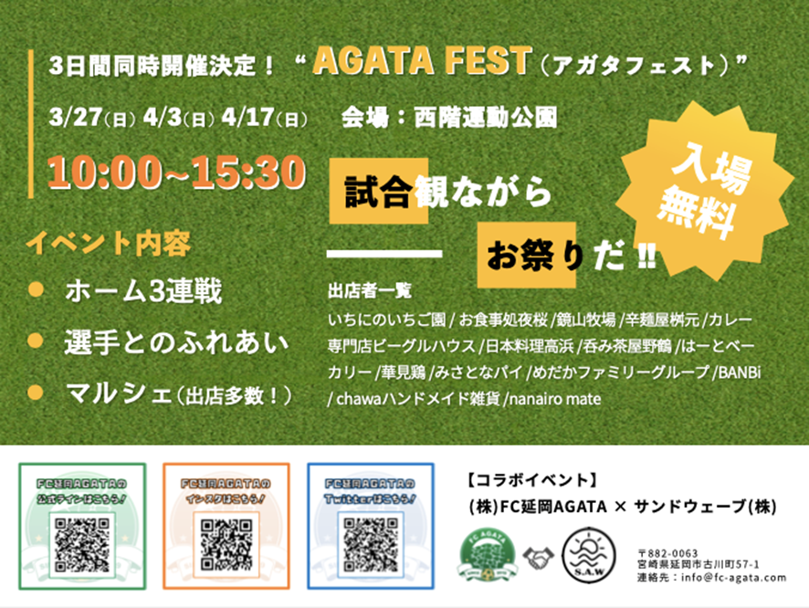 また、当日は試合開催と同時にマルシェイベント『AGATA FEST(アガタフェスト)』を開催致します。