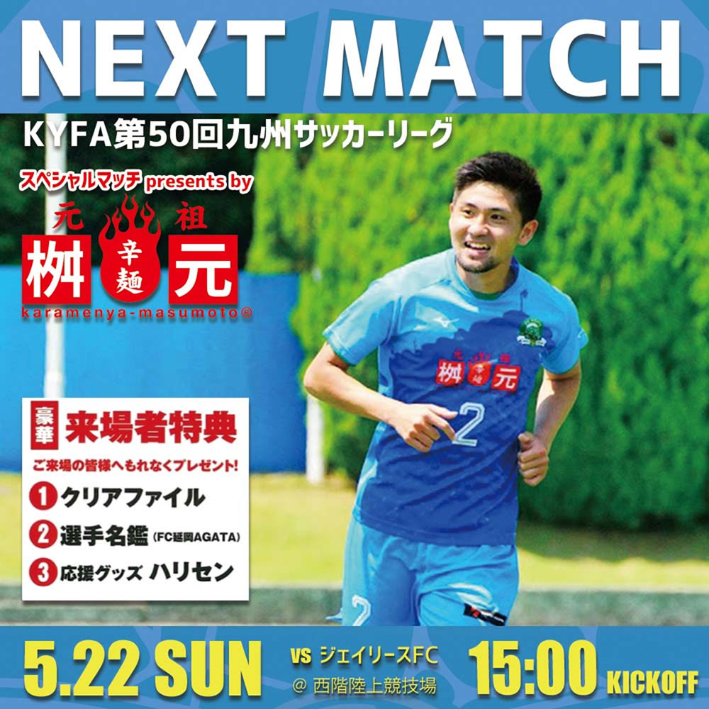 2022年 第50回九州サッカーリーグ第8節FC延岡AGATA vs ジェイリースフットボールクラブが5月22日(日)に延岡市西階運動公園陸上競技場にて下記の通り開催します(入場無料)。
