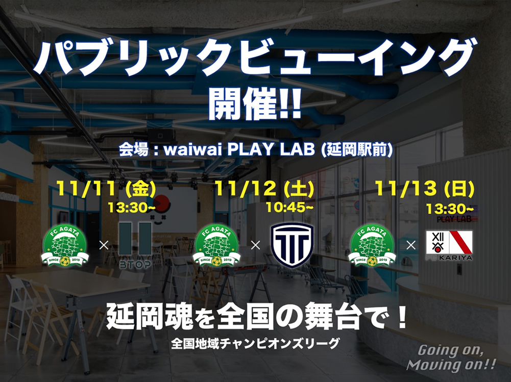 この度、2022年11月11(金), 12(土), 13(日)に行われる全国地域チャンピオンズリーグ2022の試合のパブリックビューイングが、ケーブルメディアワイワイのご協力により、延岡市内waiwai PLAY LAB(延岡駅前)にて開催されることが決定いたしました。