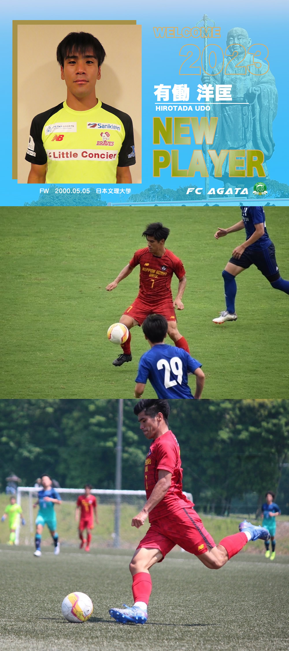- この度はFC延岡AGATAに加入する事ができ大変嬉しく思います。「リーグ優勝」「JFL昇格」に貢献し個人目標で得点王を目指してチームを勝利に導きたいと思います。スタッフ・チームメイト・サポーターの皆様と共に闘うので応援よろしくお願いします。