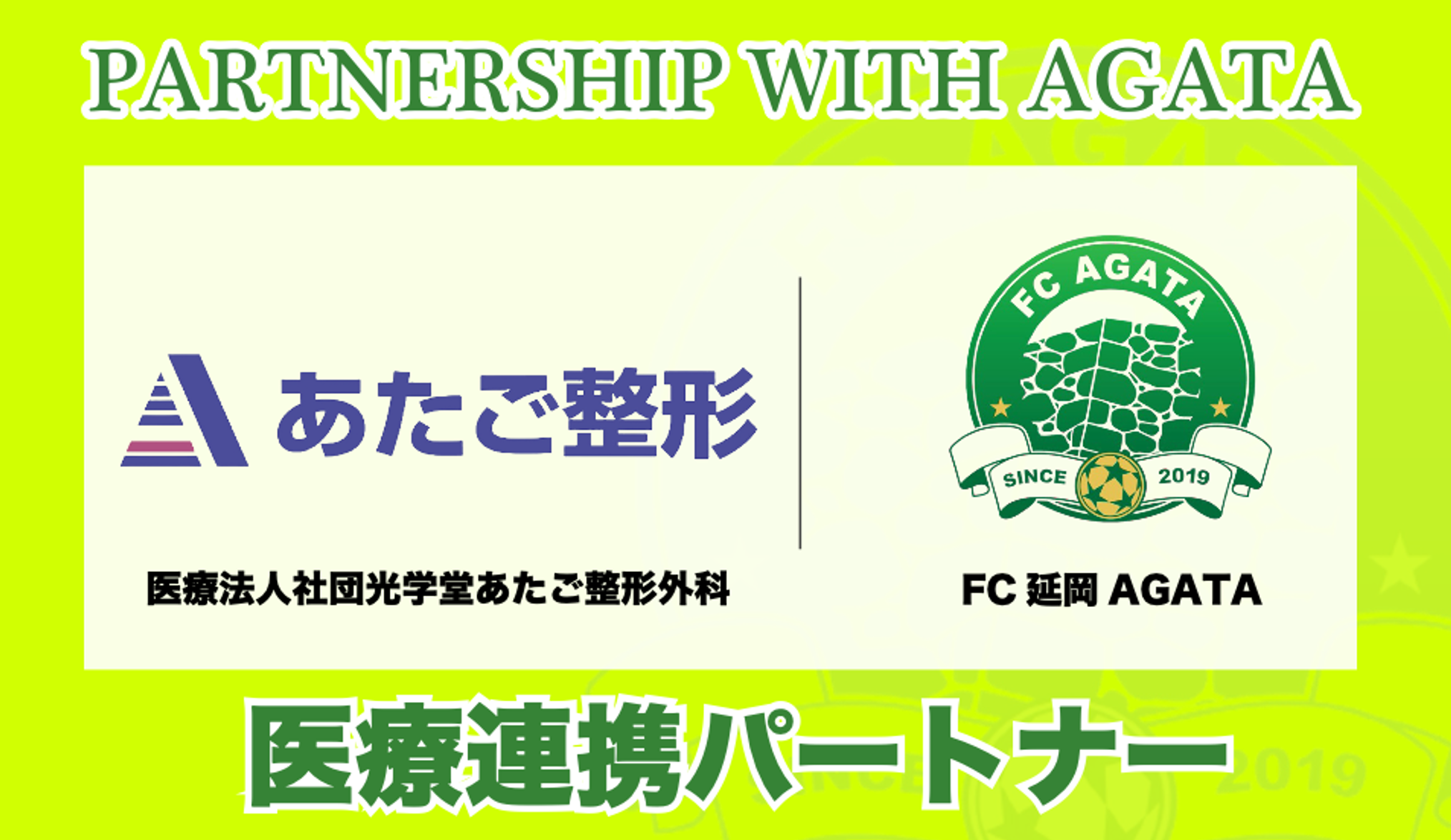 この度FC延岡AGATAは、医療法人社団光学堂あたご整形外科様(所在地:宮崎県延岡市愛宕町3丁目161番地、理事長:佐藤 信博様)とパートナー契約を締結し、2024シーズンよりご支援いただくこととなりましたので、下記の通りお知らせいたします。