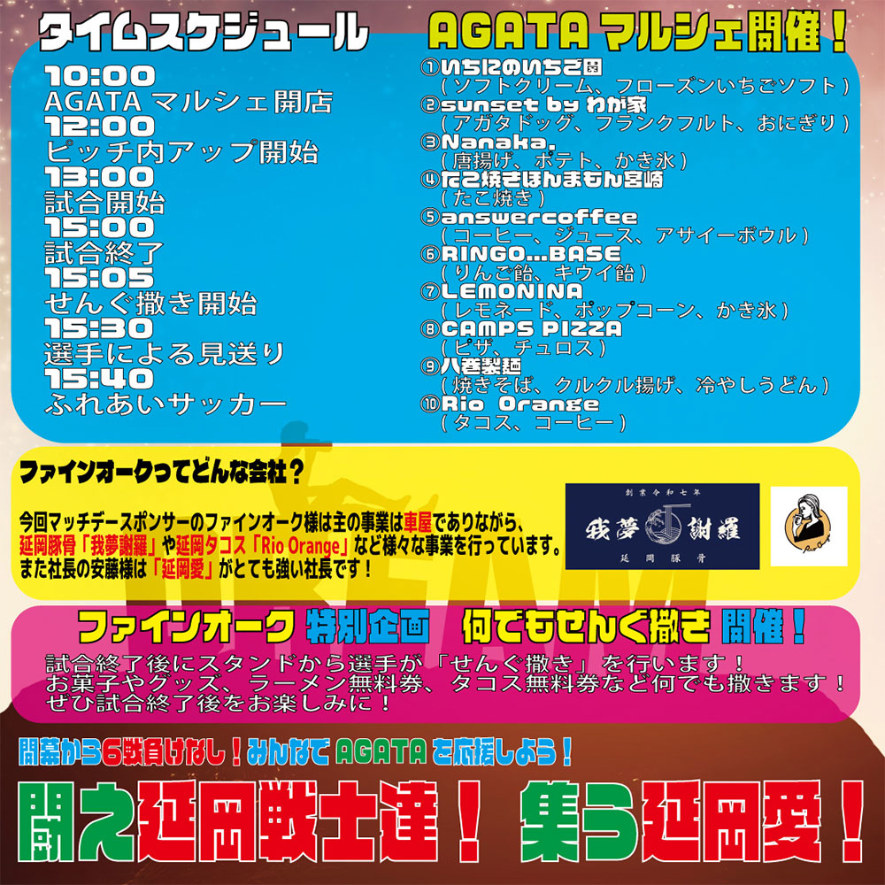 10:00 AGATAマルシェOPEN 12:00 ピッチ内アップ開始 13:00 試合開始 15:00 試合終了 15:05 何でもせんぐ撒き開催 15:30 選手による見送り 15:40 ふれあいサッカー(雨天時中止の可能性あり)