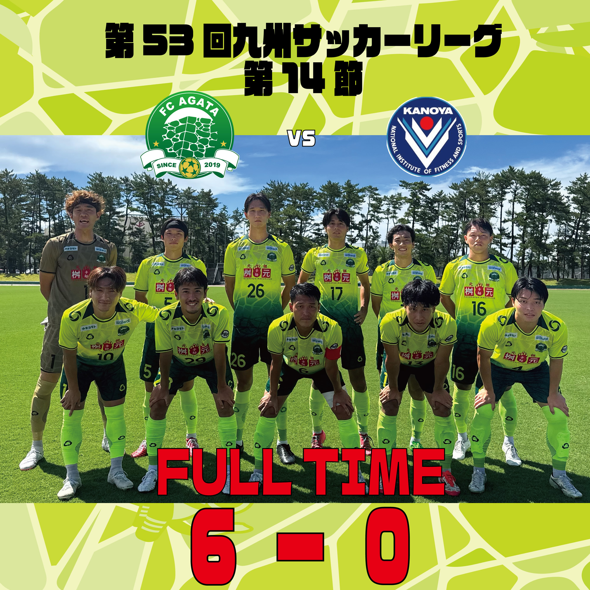 開始からお互いにオープンな展開で試合が進みカウンターから何度かAGATAがチャンスを作ります。13分には自陣のミスから決定的なピンチを招きますが田渕選手のセーブで失点を許しません。21分には相手陣内の高い位置でボールを奪い宍戸選手が亀井選手へスルーパス、亀井選手が相手選手を引き連れゴール前の永松選手にパスを送り永松選手が決め先制に成功します。28分にはフリーキックのこぼれ球を相手選手がハンドしPKを獲得。吉武選手が落ち着いて決め2-0とします。その後もAGATAが押し込む時間帯が増えさらに40分には宍戸選手の中盤でのキープから裏のスペースへ走り込んだ山下選手へパスを送り山下選手が豪快に決め3-0とリードを広げます。前半終了間際には内山田選手、竹村選手、松村選手の連携した守備からボールを奪い宍戸選手を経由し亀井選手にパス、亀井選手がゴール前で2人をかわし、再度宍戸選手にパスを送り冷静に決め、4-0で前半を折り返します。後半からも攻撃の手を緩めることなくサイドを起点にゴールを目指します。68分にはコーナーキックからシムヒョンミン選手が打点の高いヘディングでゴールを決め5-0とします。84分には松村選手のパスカットから吉武選手が40mのロングスルーパスを内山田選手に送り、クロスボールを阿部選手が落ち着いて決め6-0とします。その後も攻撃を続けますが追加点は奪えず試合終了となりました。