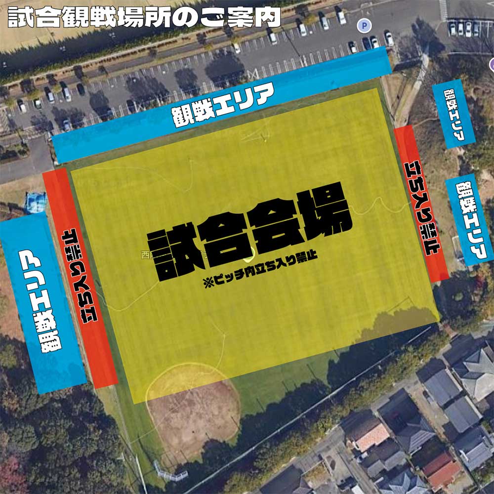 西階球技場は、固定椅子の観覧席がなく、全て芝生席となります。 ご来場の際は椅子やレジャーシートの持ち込みをおすすめします。 観覧席はピッチに非常に近くなっています。ボールの行方にご注意ください。