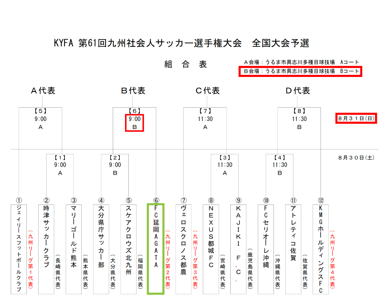 FC延岡AGATAは九州リーグ第2代表として出場し、8月31日(日)に大分県庁サッカー部(大分県代表)-スケアクロウズ北九州(福岡県代表)の勝者と対戦します。